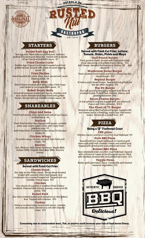 Welcome to Rusted Nut, your premier pub in Osceola, PA! Enjoy a vibrant atmosphere filled with excellent cocktails, local specialties, and a grand selection of beers. Whether you're joining us for lunch, dinner, or a solo outing, reservations are strongly recommended for Friday and Saturday evenings to ensure your spot. Dine on our inviting terrace or take advantage of our fast service and delicious takeout options. Join us for live concerts, sports, and café games, all in a family-friendly environment. With accessible seating and amenities, everyone is welcome at Rusted Nut—where great food and fun collide!