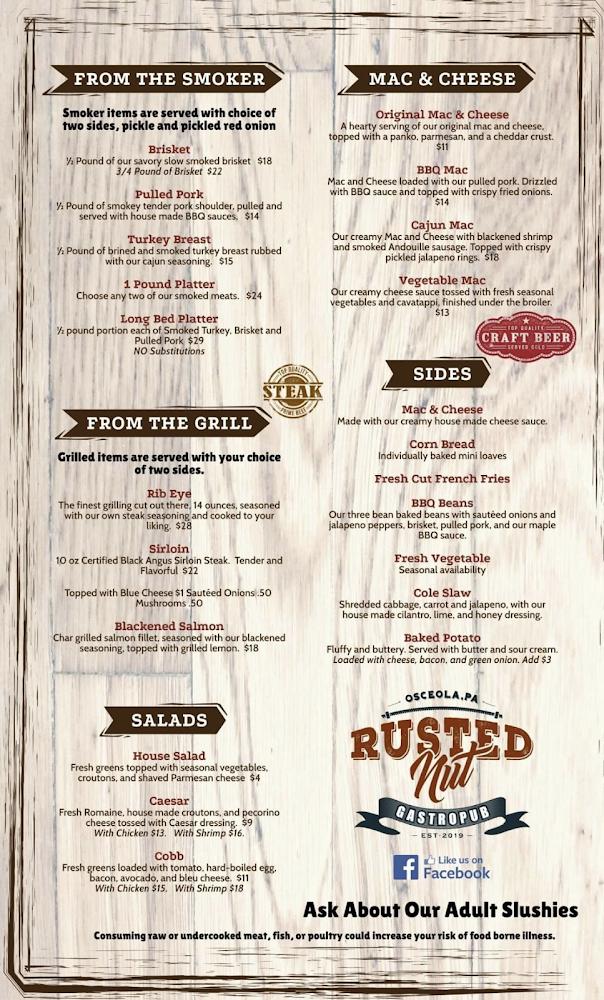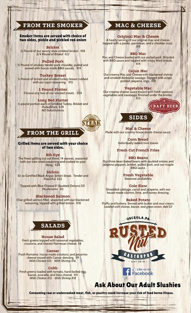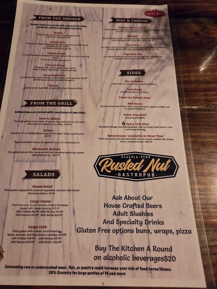 Rusted Nut offers an extensive menu focused on BBQ. Items like brisket and pulled pork stand out as favorites. The menu includes unique options from the smoker, grill, and salads alongside hearty sides such as mac and cheese and cornbread.